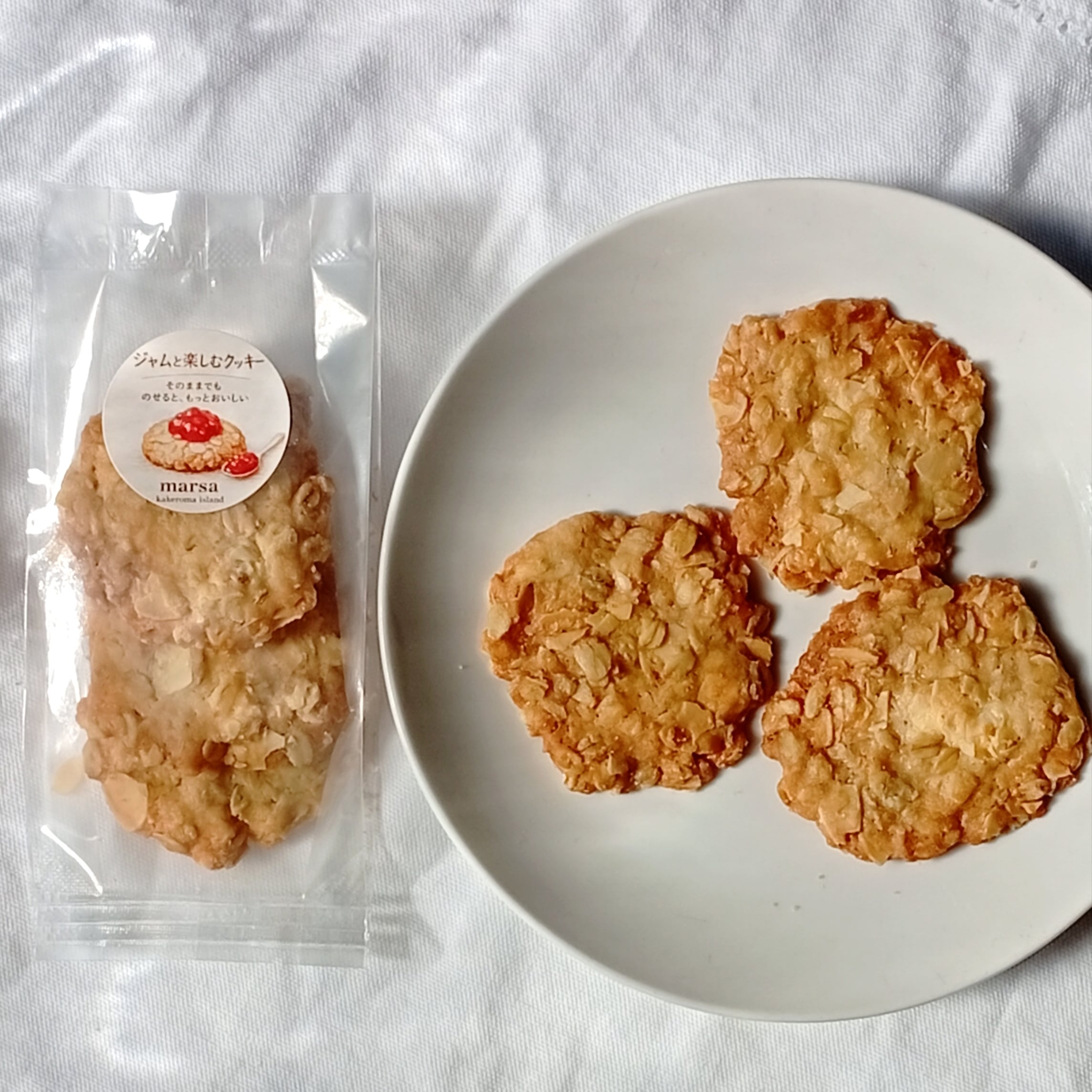 marsaのジャムの美味しさを引きたてるように、甘さ控えめ、オートミールとスライスアーモンドのクッキーを作りました。